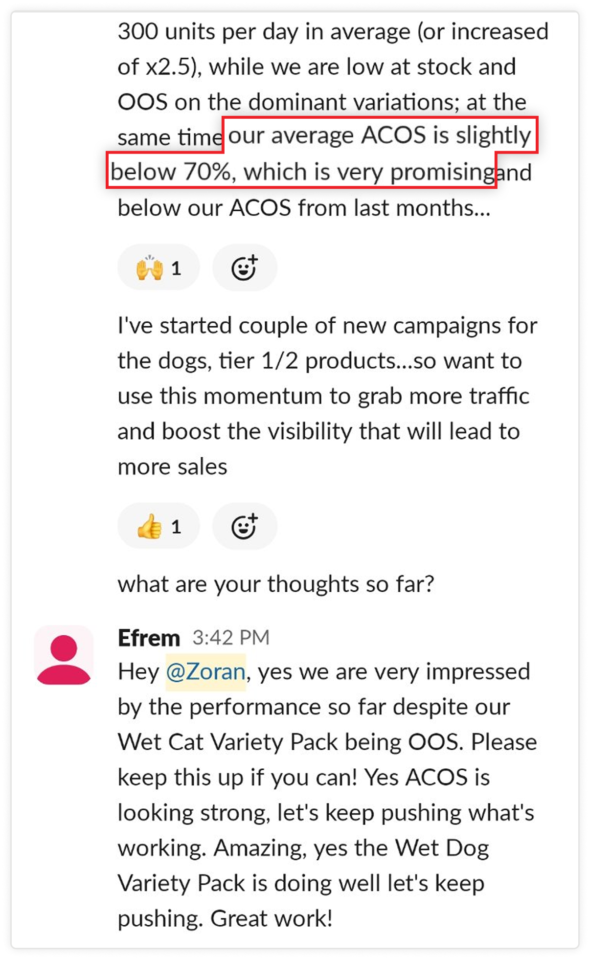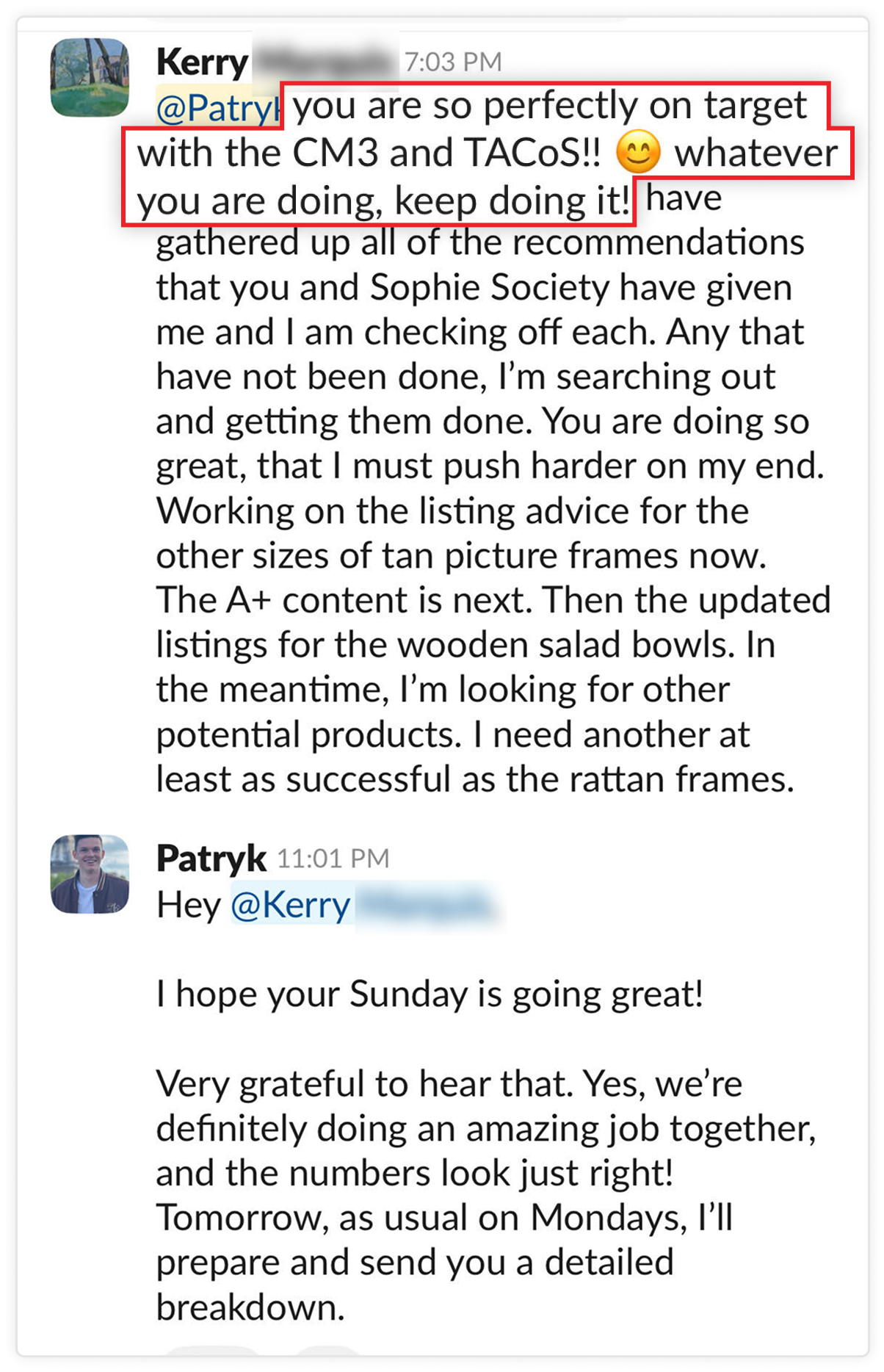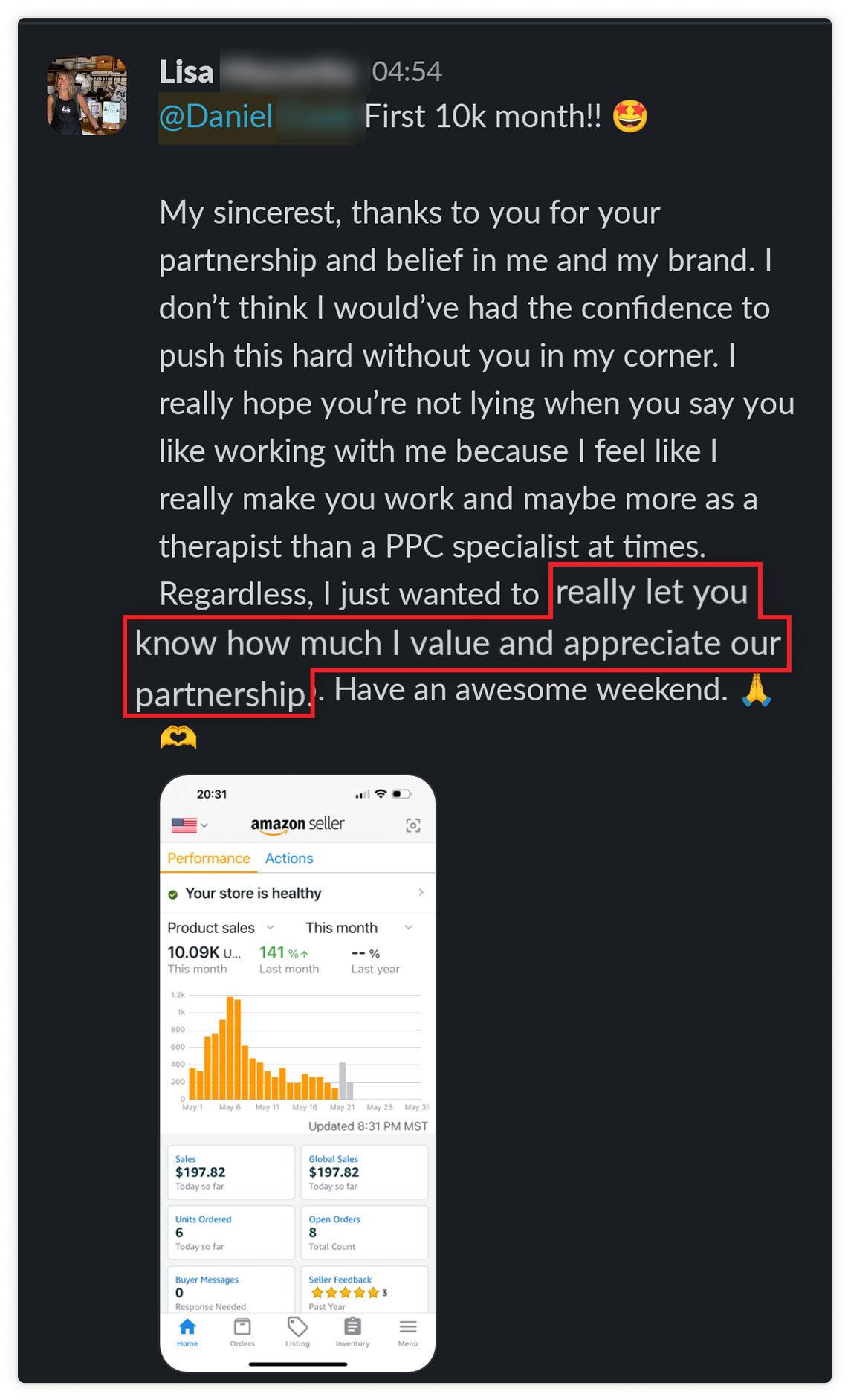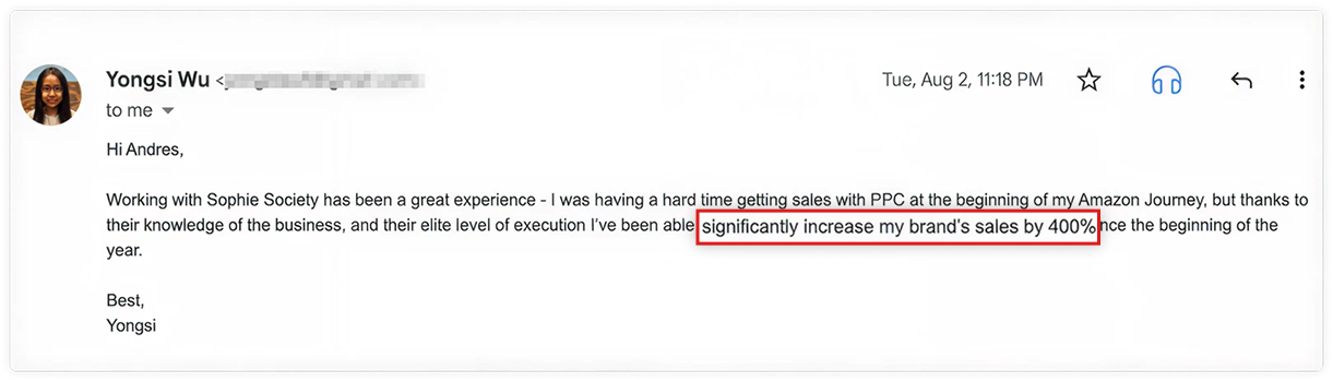 The brand is now back on track for growth with consistent performance, strong margins, and a trusted strategist (Pablo) leading the way. Robert was more than satisfied with the performance and now refers other Amazon sellers he knows to Sophie Society.